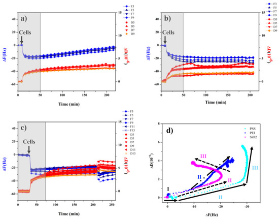 At variance with this, for cells on PSS-ended surfaces (Figure 7c), an abrupt frequency decrease was observed, qualitatively diagnostic of a diffuse cell adhesion to the substrate, followed by small frequency changes. The related dissipation was found to be significantly higher than the one for SiO2 and PEI, suggesting that in this case, the contact sites were more viscous than in those cases and that the cells are substantially more mobile on the surface, prompting the efficient cell spreading process responsible for the best cell seeding on PSS-ended substrates [36]. Finally, the ΔD/ΔF plots for the cell adhesion to the three surfaces are reported in Figure 7d. In particular, for each substrate, different regions can be seen: region I, common to all substrates, is characterized by a slightly increasing ΔF, while ΔD does not change, suggesting that the cells are merely adhered to the surface by gravity. Furthermore, in region II, for the SiO2 substrate (magenta triangles in the figure) ΔF decreases and ΔD increases steeply, suggesting the occurrence of firm cell attachment, while, in region III, a greater mass removal, with only a smaller increase in dissipation compared to region II, is observed, indicating the detachment of loosely attached cells.