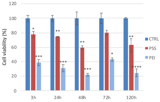Cell viability: MSCs show different viability towards PSS and PEI after 3, 24, 48, 72, and 120 h. Results are presented as mean ± standard deviation (S.D.) of three independent experiments and normalized with respect to the control untreated cells (* p < 0.05, ** p < 0.01, *** p < 0.001, and **** p < 0.0001 versus CTRL, one-way ANOVA).