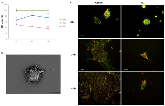 Effect of the PEI layer on (a) ATP content and (b) ultrastructure and mitochondrial transmembrane potential (ΔΨ) on MSCs. (a) Values (cps) are derived from the average of three experiments and expressed as percentages referring to the control; * p < 0.05 and ** p < 0.01 versus CTRL (one-way ANOVA). (b) Scanning electron micrography; scale bar: 10 µm. (c) ΔΨ analyzed with JC1 red represents J-aggregates, i.e., active mitochondria; scale bar: 10 µm.