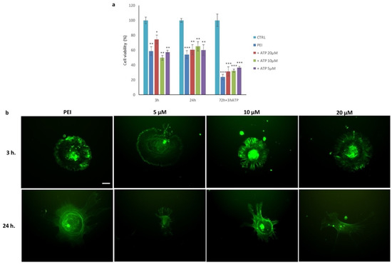 The decrease in ATP shown in cells grown on the PEI-ended surface could be the cause of the dysfunctions of the numerous ATP-dependent cellular functions and of the entire cell metabolism. These low ATP levels of MSCs adhering to PEI-ended could be due to a destabilization of the plasma membrane that makes the mitochondrial component more accessible [40]. The alteration of the plasma membrane is via an SOS protein, which establishes a link between FAK activation and a well-established mitogenesis pathway. Furthermore, cell attachment via integrins controls the cellular sensitivity to the growth factor. This synergy between signals generated by cell adhesion receptors and the growth factor receptors helps to observe the SEM image shown in Figure 9b. The ΔΨ analysis, carried out in 3, 24, and 48 h (Figure 9c) with the fluorescent JC-1 dye, showed a decrease in mitochondrial activity in PEI samples, maybe due to an impairment of electron transport through the inner membrane coupled to proton pumping. From the observation under the fluorescence microscope, we noted a limited mitochondrial activity in PEI-ended samples in all experimental times analyzed and a greater concentration and distribution of mitochondria at the cytoplasmic level, with respect to the control cells spreading on the uncoated substrate. Given that the decreased mitochondrial activity does not permit the restoration of the intracellular ATP concentration necessary to reactivate a correct metabolic pathway, we studied the effect that extracellular ATP has on MSCs seeded on the PEI coating and supplemented the culture medium with different concentrations of ATP. After 72 h, we replaced the medium with fresh medium containing ATP (20 µM, 10 µM, and 5 µM) for 3 h and measured vitality by MTT (Figure 10a) and stained microfilaments with FITC-phalloidin (Figure 10b).