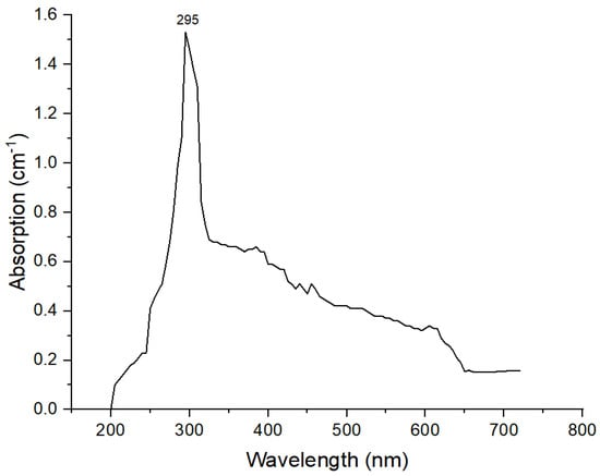Synthesis was confirmed by a UV/visible spectroscopy peak of maximum absorption observed between 290 and 310 nm. These results confirmed the synthesis of TiO2 NPs. A maximum absorption peak was observed at 295 nm, the UV spectrum is shown in Figure 1. The results agreed with previously reported literature, where the peak was observed at 310 nm [,].