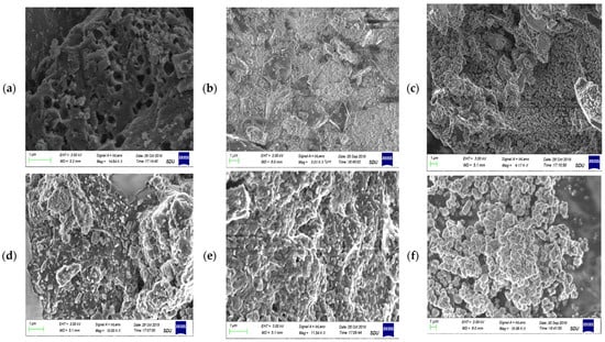 The morphology of prepared adsorbents is described in Figure 2. SEM micrographs of the MBM, BC and TiO2 NC are shown in Figure 2a–c which shows the bulky and smooth morphology of the bare biosorbents. MBM has hollow spaces, while biochar and TiO2 NC have agglomerated structures, Figure 2d–f shows Cr(VI) loaded biosorbents. A clear difference can be seen between the surface morphology of Cr(VI) loaded and unloaded biosorbents at the same magnification.