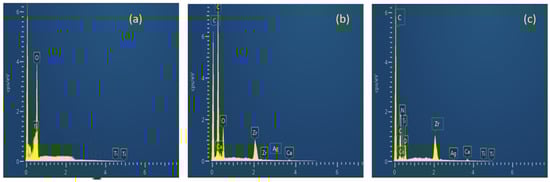 EDX spectra of (a) TiO2 NP; (b) biomass; and (c) TiO2 NC.