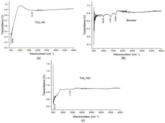 FT-IR spectra of (a) TiO2 NP; (b) biochar; and (c) TiO2 nanocomposite.