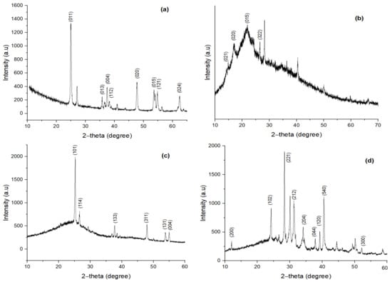 The diffraction pattern of BC is given in Figure 5c. Strong diffraction peaks are present at 2θ values at 16°, 19°, 20.4°, 24.6°, 25.1°, 27°, 33.3°, 38.2° and 42.2°are associated with planes (021), (020), (051), (322), (202), (023), (230), (032) and (112). These signatures relate to crystalline carbon with expanded lattice parameters (carbon with impurities) []. The calculated particle size through Scherrer’s formula was 0.932.