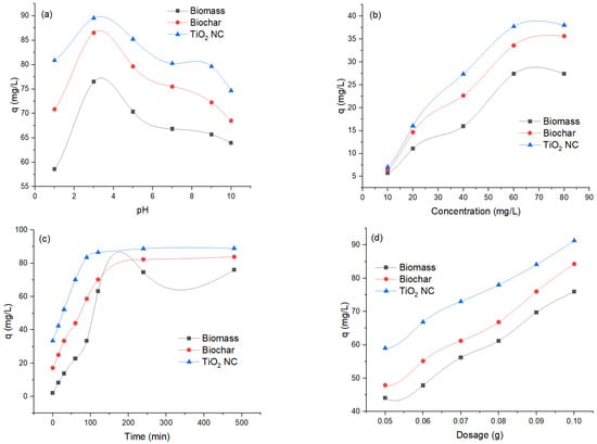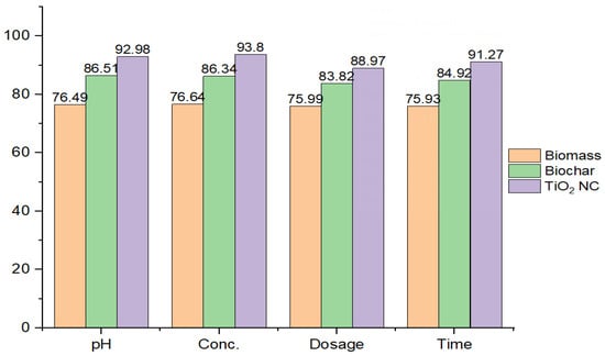 At the start of the process, there was a higher concentration gradient between adsorbent and heavy metals ions that sped up this process and percentage removal increased by increasing contact time from 0 to 120. At the initial stage of adsorption, a large number of vacant sites were available. As time passes, functional groups present on the surface of the adsorbent take part in the process of adsorption of heavy metals until equilibrium is achieved. The percentage removal increases with an increase in contact time and becomes constant after attaining equilibrium. After equilibrium, the adsorption process may get slow down due to the contribution of other processes, i.e., complexation, saturation of binding sites and micro-precipitation. As the equilibrium was achieved, no more Cr(VI) ions were further adsorbed by increasing contact time because there was no vacant site available resulting in optimization of contact time for the adsorption process. The maximum removal was observed at 88.97 for TiO2 NC and maximum uptake in mg/L of chromium was decreased to 88.97 (TiO2 NC) > 83.82 (BC) > 75.99 (MBM). The effect of contact time on adsorption of Cr(VI) by using MBM, BC and TiO2 NC is graphically represented in Figure 6c.