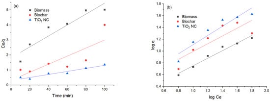 Generally, the Langmuir isotherm reveals that the surface of biosorbent and Cr(VI) has equal sites which have the same energy. According to this model, adsorbate molecules do not interact with each other but only interact with the site. Adsorption is restricted to monolayers. It is concluded that once a Cr(VI) ion adsorbs with a site, no more adsorption occurs. When equilibrium was achieved a monolayer appeared [], which represents the plot of Ce/qe (g/L) versus Ce (mg/L) under various concentrations of Cr(VI) sorption by MBM, BC and TiO2 NC. Most of the points in this graph are out of linearity. The values obtained in the Freundlich model are greater than the R2 value of the Langmuir model, which suggests the non-applicability of this model in interpreting sorption equilibrium data [].
