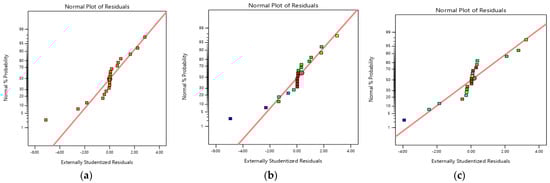 The main purpose of any designed experiment is to attain optimum response. RSM is one of the best techniques among all the available techniques. This process mainly helps to understand how test variables affect the selected process response, determine the possible interaction among the test variables, and characterize the combined effect of all test variables on the process response []. RSM is used to evaluate the effect of different parameters and for the prediction of targeted response to optimize the reaction. In the present research, interaction and optimization of three important independent variables, i.e., pH (A), initial concentration of Cr(VI) (B) and adsorbent dosage (C) were investigated by using Box–Behnken experimental design for the adsorption of Cr(VI) []. The main purpose of the developed model was to analyze the data of the experiment. The studentized residual and normal probability plot is depicted in Figure 10. It can be seen that there was neither any apparent problem with normality nor response transformation in Figure 10 []. All the dots lie near the regression line which showed a good correlation between the normal percentage probability and internally studentized residuals.