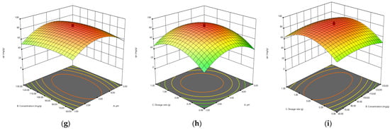 The 3D plots showing the interaction of (a) pH × concentration, (b) pH × adsorbent dosage, (c) concentration × adsorbent dosage by biomass; (d) pH × concentration, (e) pH × adsorbent dosage, (f) concentration × adsorbent dosage by biochar; (g) pH × concentration, (h) pH × adsorbent dosage, (i) concentration × adsorbent dosage by TiO2 NC for adsorbtion of Cr(VI).