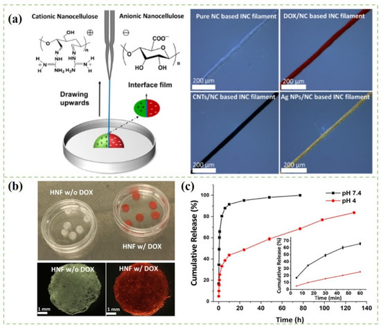 The emulsion method is widely used to prepare drug nanoparticles. The emulsion system is considered as a promising drug delivery system because of its unique characteristics, such as colloidal stability and easy encapsulation of different compounds [74]. It is commonly emulsified and polymerized in aqueous medium by using high-performance surfactant and emulsion stabilizer [75]. Moreover, the encapsulation of drugs in emulsion also helps to preserve and protect drugs from gastrointestinal hydrolysis and enzymatic degradation. As shown in Figure 2, nanocomposite filaments with diverse functions (drug-loading performance, conductivity, or antibacterial properties) were fabricated by the approach of interfacial colloidal nanoparticle complexation (INC), which was fabricated from oppositely charged colloidal nanocelluloses [76]. Figure 2c depicts the cumulative release curves of doxorubicin hydrochloride (DOX) in different pH media. Obviously, the drug release rate was affected by the pH value of the medium solution. The drug release rate of DOX at physiological pH (pH 7.4) was faster than that under acidic conditions (pH 4.0). The differences in the initial burst release behavior in pH 7.4 and 4.0 were presumably attributed to the different swelling ability of the INC filaments in these aqueous buffers. Low et al. [77] reported a Fe3O4@cellulose nanocrystals-stabilized Pickering emulsion containing curcumin for magnetically triggered drug release. The drug release rate was increased after the stimulation of the external magnetic field. An MTT (3-(4,5-dimethylthiazol-2-yl)-2,5-diphenyltetrazolium bromide) experiment demonstrated that the curcumin-loaded nanomaterials could effectively inhibit human colon cancer cell growth in the presence of a magnetic field. The results suggested that CNCs-based nanomaterials could be used as a promising colloidal drug carrier.