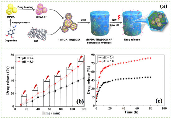 (a) Schematic illustration of the fabrication of the MPDA@GO/CNFs composite hydrogel; (b) NIR-light-triggered drug release behavior from MPDA@GO/CNFs composite hydrogel in different PBS solution at 37 °C; (c) In vitro drug release profiles of the MPDA@GO/CNFs composite hydrogel [106].