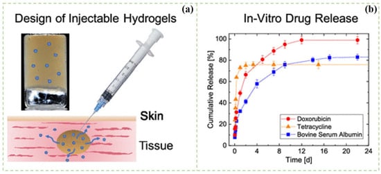Compared with ordinary hydrogels, injectable hydrogels also have been widely explored as an important part in drug delivery systems. Injectable hydrogels have appeared as promising drug delivery materials because of their properties such as similarity to the ECM, ability to access deep-seated areas, highly porous structure, and capability of enclosing cells within the matrix. A polymer solution with a low viscosity and gel ability after injection can be used to obtain injectable hydrogel. The nucleophilic substitution method can be used to prepare injectable hydrogels for drug delivery and tissue-engineering applications [107,108,109,110]. Injectable hydrogels present a free-flow behavior before injection, but spontaneously change to semisolid hydrogel after gel formation due to the chemical or physical crosslinking reactions. Bertsch et al. prepared the CNC composite injectable hydrogels by salt-induced charge screening (Figure 5). The injectability of the hydrogel was evaluated by the combination of shear rheology and capillary rheology, which showed that the CNC hydrogel was transported through the plug flow in the capillary [111]. The CNC hydrogels were used as drug carriers for the in vitro release of bovine serum albumin (BSA), tetracycline (TC), and doxorubicin (DOX) in normal saline and simulated gastric juice. For TC, a burst release was observed within 2 days, whereas BSA and DOX both showed a sustained release for 2 weeks. The different release behaviors were attributed to drug size, solubility, and specific drug–CNCs interactions. Orasugh et al. [112] added CNCs in the triblock poloxamer copolymer (PM) to obtain composite injectable hydrogels. They found that the PM/CNC hydrogel had good strength and a lower gel temperature, which was attributed to the formation of intermolecular hydrogen bonds between the free hydroxyl group of the CNC molecule and PM molecule. Moreover, injectable hydrogels can undergo reversible phase transitions triggered by pH, temperature, solvent composition, electric field, ionic strength, or light [113].
