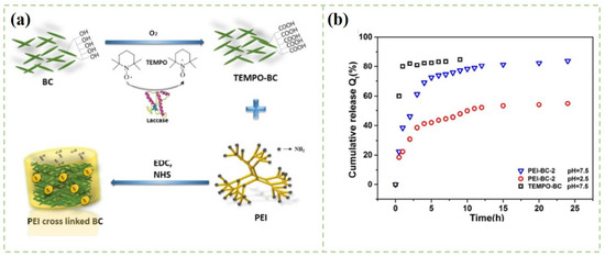 (a) Schematic illustration of the preparation of the PEI-BC composite aerogels; (b) The cumulative release curves of aspirin [128].