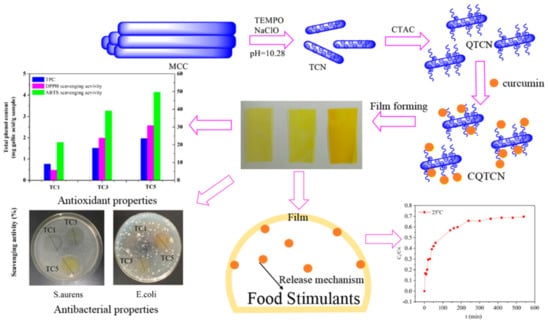 - Qianyun, M.; Lele, C.; Tieqiang, L. Active tara gum/PVA blend films with curcumin-loaded CTAC brush-TEMPO-oxidized cellulose nanocrystals. ACS Sustain. Chem. Eng. 2018, 6, 8926–8934. [Google Scholar] [CrossRef]