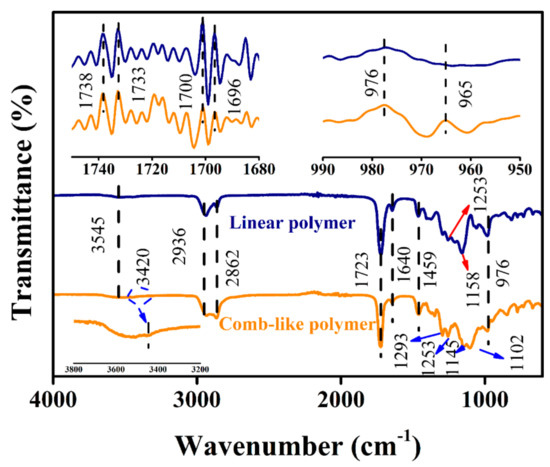 The FTIR spectrum and the second derivative spectrum of both Entry 3L and Entry 3C are shown in Figure 2. The broad absorption peak at 3545 cm−1 is the stretching vibration peak of O−H, and the absorption peak at 3420 cm−1 in the spectrum of comb-like polyester is the stretching vibration peak of N−H. The stretching vibration peaks of −CH3 and −CH2 appear at 2936 cm−1 and 2862 cm−1, and the peak at 1459 cm−1 belongs to −CH3 and −CH2 bending vibration. The difference of the peak at 1723 cm−1 was amplified by the second derivative spectrum. The peak at 1740 cm−1 belongs to the carbonyl ester C=O, which is attached to C−C bonds. The peak that appears at 1700 cm−1 is ascribed to the carbonyl ester C=O attached to the C=C bonds. The two peaks at 1253 cm−1 and 1102 cm−1 belong to the asymmetric stretching vibration and symmetric stretching vibration of the carboxyl group C−O−C, respectively [30]. After the aza-Michael addition was accomplished, the ratio of the C−O−C peak intensity to the C=O peak absorption intensity increased, which indicated that the addition reaction was successful. The two peaks observed at 1640 cm−1 and 976 cm−1 are ascribed to the C=C tensile vibration and the trans C=C−H out-of-plane bending vibration, respectively. The peak intensity at 976 cm−1 was enhanced after aza-Michael addition, which indicates that cis units reduced in the addition process.