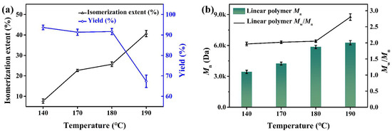 Effect of reaction temperatures on the isomerization extent and yield (a), Mn and Mw/Mn (b) of polyester.