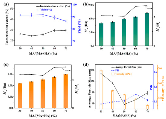 Isomerization extent and yield (a), Mn and Mw/Mn of linear polyester (b) and comb-like polymer (c), particle size and viscosity (d) of polyester dispersions in different MA/(MA + HA).