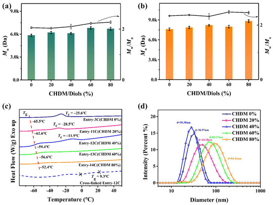 Molecular weight and polydispersity for linear polyester (a) and comb-like polyester (b), DSC curves of comb-like polyester and part of cross-linked polyester (c), and average particle size of dispersions (d) in different CHDM content.