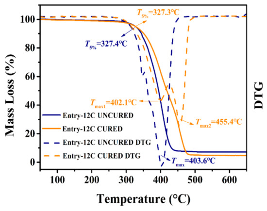 The thermal degradation behaviors and DTG curves of Entry 12C are shown in Figure 7, and some crucial data are also displayed. The degradation curve of the cross-linked polyester in the first step was almost the same as the pure polyester, which was reflected by the same 5% weight loss temperature (327 °C) and the maximum weight loss rate temperature (403 °C). This step degradation was attributed to the ester and aliphatic moieties. The Tmax2 (455 °C) was observed in the cross-linked sample, which indicated the cross-linked polyester degraded by a multistep process. The reason might be that the hard segment urethane bonds formed after cross-linking, which reduced the migration of the chain segments. The thermal stability of the material was enhanced after cross-linking [61].