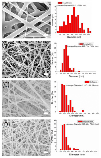 SEM image and size distribution of (A) pristine PLGA nanofibers, (B) doxycycline-loaded nanofibers, (C) collagen-loaded nanofibers, and (D) bupivacaine-loaded nanofibers.