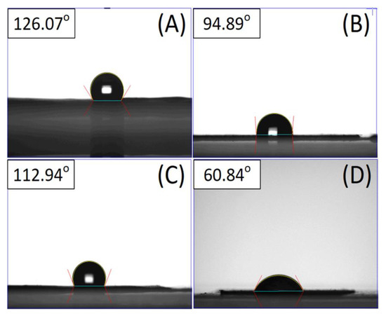 Wetting angles of (A) pristine PLGA nanofibers, (B) doxycycline-loaded nanofibers, (C) collagen-loaded nanofibers, and (D) bupivacaine-loaded nanofibers.