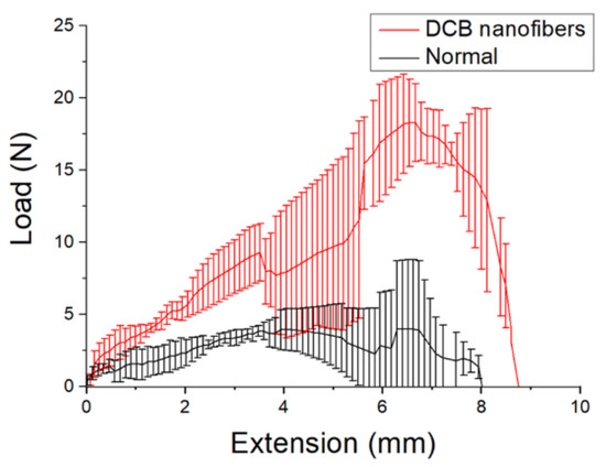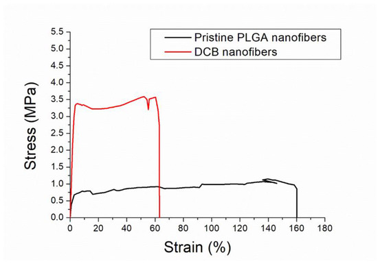 The stress–strain curves of the spun nanofibrous mats were measured. The empirical data in Figure 3 illustrate that the DCB-composite nanofibers have a higher tensile strength and lower elongation at break than the pristine PLGA nanofibers.