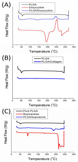 Figure 4 compares the thermal behaviors of the pristine PLGA and biomolecule-loaded PLGA nanofibrous mats. After doxycycline was loaded in the PLGA matrix, the endothermal peak at 181 °C vanished [29], and the exothermal peak near 237 °C declined (Figure 4A). In Figure 4B, the glass transitional peak of PLGA near 52 °C almost disappeared after the incorporation of collagen, while in Figure 4C, the peaks of bupivacaine at 91.6 °C and 265.8 °C almost diminished after being included in the bulk PLGA [30]. These results confirm the successful incorporation of doxycycline, collagen and bupivacaine into the PLGA nanofibrous scaffolds.