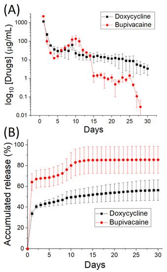 In vitro (A) daily and (B) cumulative release of doxycycline- and bupivacaine-loaded PLGA nanofibers.