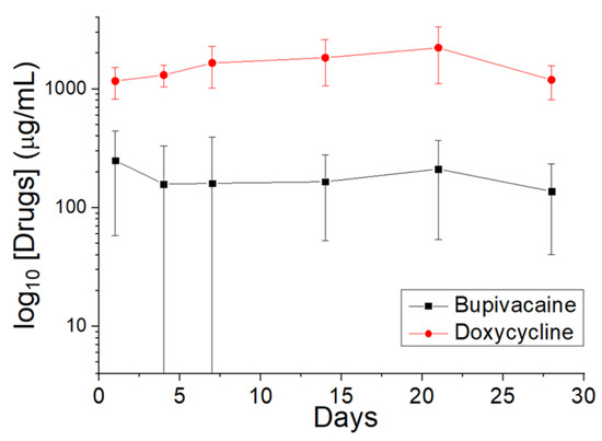 In general, the release of biomolecules from the degradable nanofibrous mats comprises three stages: a primary peak release followed by diffusion- and degradation-governed release. Most of the loaded biomolecules were embedded in the bulk of the PLGA nanofibers during electrospinning. Nevertheless, the pharmaceuticals loaded on the surface of the nanofibers cause a primary peak. After an initial burst, the discharge behavior is mainly controlled by osmotic diffusion and polymeric degradation. In our study, a second discharge peak of doxycycline and bupivacaine was observed on day 7. Subsequently, a gradually diminishing profile was observed. In contrast, in the in vitro discharge profile, a sustained release of the loaded pharmaceuticals was observed without a primary release peak because in vivo metabolism is generally slower than in vitro metabolism, and the in vivo primary peak release was reduced.