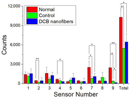 The rats were housed within the ABC to examine their postoperative bioactivities. Figure 7 reveals that both the SD rats in the DCB-composite nanofibers and control groups (surgery only) exhibited inferior activity compared to the normal rats (no surgery). However, the rats implanted with the DCB nanofibers exhibited a greater activity count than the control rats, although the difference was insignificant (p > 0.05).