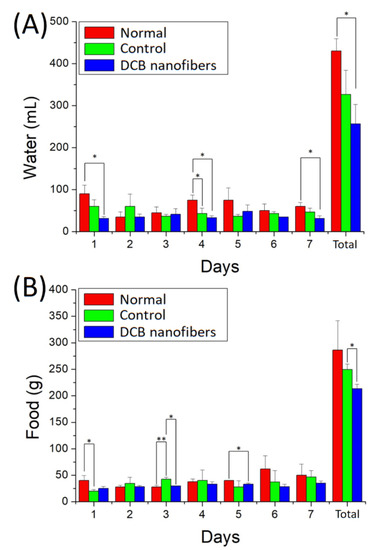 Figure 8A,B show the water and food intake of the animals. The results suggest that the rats that received DCB nanofiber implantation consumed less water and food than those in the normal and control groups after the surgery.