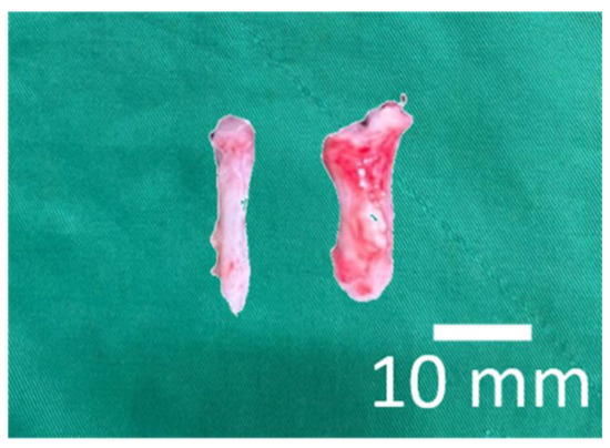 Figure 9 shows the measured tensile strengths of the repaired tendons at eight weeks post-implantation. The DCB–PLGA-composite nanofibers repaired tendons exhibit significantly higher maximum load-to-failure (18.32 ± 2.69 N) than the normal tendons (4.02 ± 4.74 N) (p < 0.01). The experimental results demonstrate the nanofibers’ capability to repair ruptured tendons. This is mainly due to the larger diameter (5.2 ± 0.9 mm) of repaired tendons when compared to that of normal tendons (2.1 ± 0.4 mm), as shown in Figure 10.