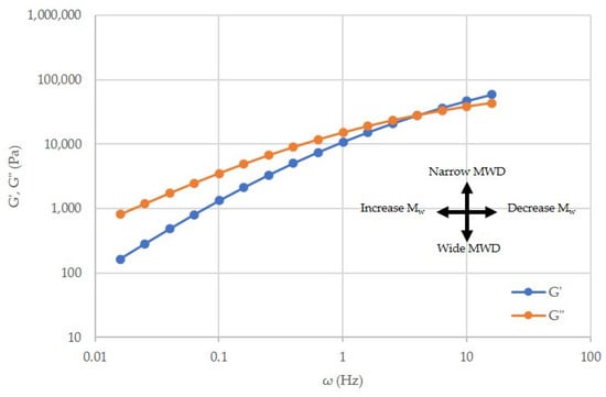 G’ and G” for unprocessed polypropylene, showing the crossover point where G’ = G”; modeled after [,].