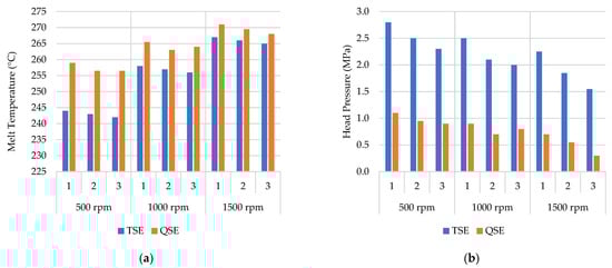 The effect of screw speed and reprocessing cycle (1–3) on the (a) melt temperature and (b) head pressure developed in the TSE and QSE.