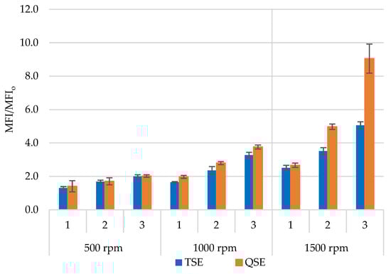 Melt flow index ratio (MFI/MFIo) for polypropylene reprocessed using the TSE and the QSE at three screw speeds and for three reprocessing cycles.