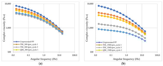 The effect of screw speed and reprocessing cycles on complex viscosity as function of angular frequency of PP material reprocessed by TSE and QSE: (a) at 500 rpm and (b) at 1500 rpm.