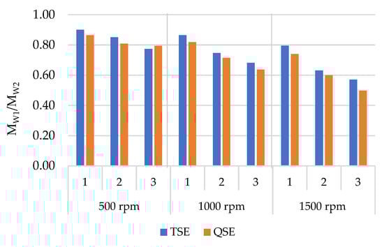 Molecular weight ratio (MW1/MW2) for polypropylene reprocessed in a TSE and a QSE using three screw speeds and three reprocessing cycles.
