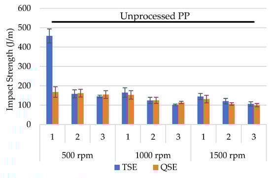 Notched Izod impact strength for polypropylene reprocessed using a TSE and a QSE with three screw speeds and three reprocessing cycles.