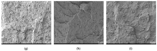 SEM micrographs for (a) unprocessed PP; PP reprocessed using a TSE; (b) first cycle at 500 rpm; (c) third cycle at 500 rpm; (d) first cycle at 1500 rpm and (e) third cycle at 1500 rpm; and PP reprocessed using a QSE; (f) first cycle at 500 rpm; (g) third cycle at 500 rpm; (h) first cycle at 1500 rpm; and (i) third cycle at 1500 rpm.
