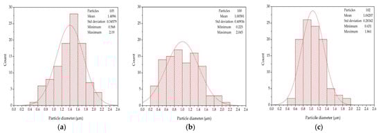 To quantify the drop in particle size and the changes in particle size distribution, the micrographs for the unprocessed PP and the first cycle of reprocessed samples by TSE and QSE at 500 rpm were analyzed particle size and particle size distribution using an image processing and analysis software (ImageJ). The particle size distribution was determined by using OriginPro 8.1 software. As shown in Figure 8a, the average particle size from the unprocessed polypropylene was 1.4 µm, and the range of particle sizes was 0.4–2.2 µm. The polypropylene reprocessed at 500 pm in the TSE had a smaller average particle size (1.0 µm) and a slightly wider but less Gaussian particle size distribution (Figure 8b). When the polypropylene reprocessed at 500 pm in the QSE, however, the average particle size was 1.0 µm, and particle size distribution was narrower (Figure 8c).