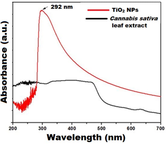 The particle size and shape are the determining factors for the optical absorption properties of NPs. To explain this behavior, UV-Vis spectra have been recorded for the cannabis sativa leaf extract and as-synthesized CS-TiO2 NPs as shown in Figure 1. For cannabis sativa leaf extract, the absorption is weak and no peaks are detected. For the as-synthesized CS-TiO2 NPs, a significant absorption peak was detected at 292 nm, providing base confirmation for the greener approach to synthesizing CS-TiO2 NPs. Nevertheless, the absorption band of the obtained biogenic CS-TiO2 NPs (292 nm) was significantly bluer than that of bulk TiO2 (380 nm), indicating the quantum confinement characteristic of NPs. Moreover, the maximum absorption band around 300 nm corresponds to the anatase phase of TiO2 NPs []. As the particle size is lowered, the absorption edge shifts to a lower wavelength, which can be described through the quantum confinement process. The optical band gap was obtained using the maximum absorption wavelength of CS-TiO2 NPs to be 4.24 eV, which is greater than the bulk titanium (3.2 eV).