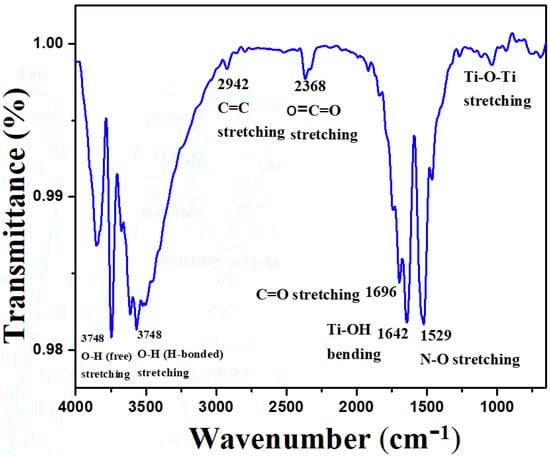 As shown in Figure 2, the FTIR spectrum of CS-TiO2 NPs derived from cannabis sativa leaf extract was investigated in the range of 4000–500 cm−1. As a result of inter-atomic vibrations, metal oxides generally have bands in the fingerprint region below 1000 cm−1 due to Ti–O and Ti–O–Ti bending vibrations []. The distinct band at 685 cm−1 is most usually related to the anatase phase and is attributed to the Ti–O vibration. The characteristics band of CS-TiO2 NPs at 1642 cm−1 is attributed to the stretching vibration of Ti–OH []. The band at 1696 cm−1 is ascribed to the C=O stretching vibration. The bending vibrations of N–O stretching are depicted by the sharp band at 1529 cm−1, whereas the bands at 2368 cm−1 and 2942 cm−1 are ascribed to O=C=O and C=C vibrations. The bands within the 4000–3500 cm−1 region inferred the H-bonded stretching and the free stretching of O-H vibrations [,]. According to established literature, cannabis sativa extract has a larger quantity of phenolics and flavonoids, which are essential for NP reduction, capping, and stability. It is noticeable from the FTIR spectra of TiO2 NPs that phytochemicals (phenols, flavonoids, cannabinoids, polysaccharides, water-soluble biomolecules, etc.) present in cannabis sativa extract are vital for bioreduction. As a result, proteins and other biomolecules containing -OH moiety attach to the NP’s surface and inhibit agglomeration [,,].