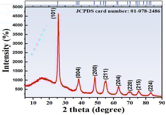 Figure 3 shows the XRD spectrum of CS-TiO2 NPs. The established XRD peaks observed at 2Ɵ values of 25.3°, 38.2°, 48.3°, 54.8°, 62.8°, 70.0°, 75.3°, and 82.1° revealed the tetragonal structure of anatase CS-TiO2 NPs with corresponding (101), (112), (200), (105), (204), (220), (215), and (224) planes, respectively. The measured peaks resemble the standard tetragonal structure of anatase TiO2 (JCPDS Card No. 01-078-2486). As shown in Figure 3, the JCPDS Card No. 01-078-2486 fits all peaks, indicating that no contaminants or mismatched peaks have been found.