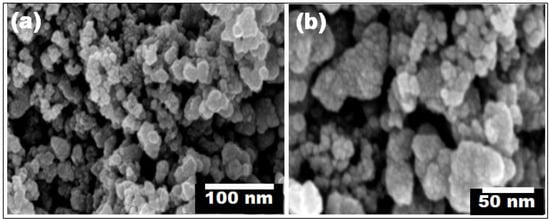 The information about the morphological characteristics of the obtained particles was provided by the FE-SEM micrographs. Figure 4 shows FE-SEM images taken at two different magnifications for the precipitated CS-TiO2 NPs after calcination at 400 °C for 4 h without ageing. It was confirmed that the particles were almost spherical in shape. As demonstrated in Figure 4, a considerable number of small and distinct CS-TiO2 NPs were found, compared to a comparatively limited number of large-sized agglomerated NPs. The average particle size of the individual CS-TiO2 NPs is 14 ± 3 nm.
