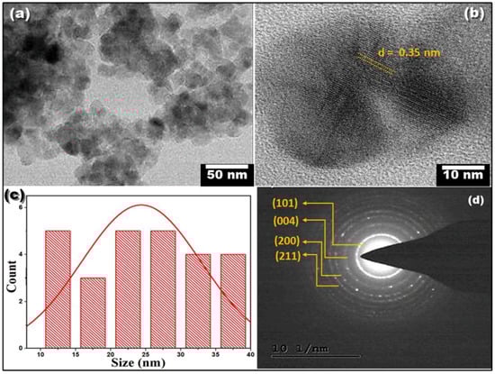 Individual CS-TiO2 particle calcination at 400 °C for 4 h is shown in the HR-TEM images, Figure 5a,b at two different magnifications. CS-TiO2 NPs have a consistent spherical form. Figure 5b shows a HR-TEM micrograph of anatase TiO2 NPs at a greater magnification. The anatase form of biogenic TiO2 (101) NPs with a fringe width of 0.35 nm was verified. i.e., the d-spacing value was found to be 0.35 nm. Figure 5c shows the histogram of the particle size distribution. The average particle size distribution of the individual particles was found to be in the range of 12.5 ± 1.5 nm, whereas the average size of the aggregates is 24.5 ± 11.5 nm. The crystalline structure of biogenic CS-TiO2 NPs was further verified by a SAED pattern, Figure 5d, with bright spherical rings corresponding to planes (101), (004), (200), (105), (211), (204), (220), and (215), respectively, of the anatase crystal [,]. The lattice fringes clearly show that the particles are crystalline with an anatase phase, which is supported by the XRD and SAED results. Hence, the brighter spot and strong rings in the SAED pattern indicate that the green method created highly crystalline titanium dioxide NPs.