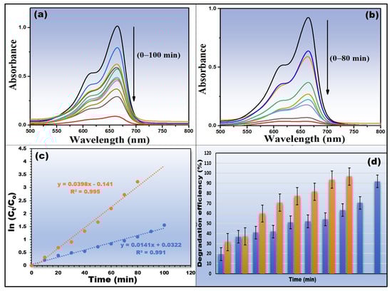 Photocatalysis study: (a,b) UV–Vis spectra of photocatalytic degradation of MB dye using 5 mg and 10 mg of green synthesized CS-TiO2 NPs, (c) pseudo-first-order kinetic study, and (d) histogram of degradation efficiency.