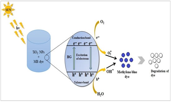 Light-dependent free radical production on the surface of CS-TiO2 NPs results in their photocatalytic activity. The photo-oxidation process begins with the light-dependent activation of CS-TiO2 NPs, which produces superoxide (O2−) ions and hydroxyl (OH) radicals, and these reactive chemicals interact with analytes to catalyze deterioration. In short, electron-hole pairs are formed when sunlight strikes the surface of CS-TiO2 NPs. Superoxide radical (O2−) anion is formed when photogenerated electrons in the conduction band react with oxygen molecules (O2). The positive holes attack the water to form hydroxyl radicals OH in the same stride. These potent oxidation reactions, O2− and OH radicals, are accountable for the photo-oxidation of dye []. Figure 7 depicts one probable dye degradation mechanism.