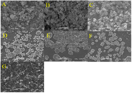 SEM images of IONPs (A), IONPs@SiO2 (B), MCM-PA@B (C–G), IONPs@SiO21:PA@B1 (C), IONPs@SiO21:PA@B3 (D), IONPs@SiO21:PA@B5 (E), IONPs@SiO23:PA@B5 (F), and IONPs@SiO25:PA@B5 (G).