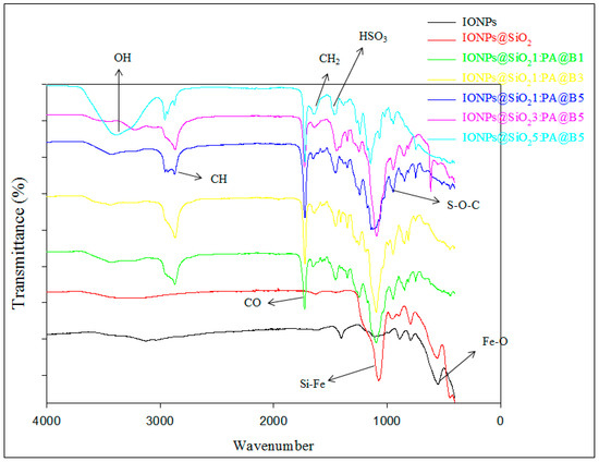 FTIR spectra of pure IONPs, IONPs@SiO2, and the fabricated MCM-PA@B with different ratios of IONPs@SiO2 and PA@B.