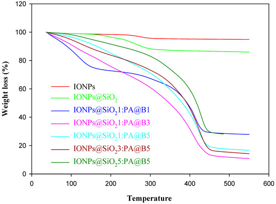 By looking into the spectra of TGA analysis given in Figure 4, we can observe two degradation stages for IONPs and IONPs@SiO2. In the first stage, the weight loss of IONPs at 125 °C is due to the loss of water molecules attached to the surface of the IONPs, while in the second stage the weight loss at 170 °C and 360 °C is due to the transformation of crystal from Fe3O4 to γ-Fe2O3 caused by heating, and only a 5% decrease in the weight of the composite occurs [47]. In the case of IONPs@SiO2, in the first stage, 2% weight loss occurs up to 230 °C due to the loss of any remaining water and volatile molecules, and then the weight loss decreases by 12% due to the conversion of Fe3O4 to γ-Fe2O3 at 360 °C, followed by no significant weight loss, indicating a higher degree of thermal stability [48]. All of the composites of CS and IONPs@SiO2 contain different amounts of poly(AMPS) and IONPs@SiO2. The graph shows the TGA of all of these composites, and indicates that each of the composite has three degradation stages. For the composites IONPs@SiO21:PA@B1, IONPs@SiO21:PA@B3, IONPs@SiO21:PA@B5; the first degradation stage occurs below 150 °C, showing a 10% loss of water and volatile molecules contents [46], followed by degradation up to 300 °C, showing the loss of sulfonate groups of the polymers up to 30%, and then 85% weight loss occurs at 450 °C due to the degradation of the polymer on the IONPs@SiO2. Above 450 °C, there is no significant change in the weight, confirming the presence of IONPs, as these particles have high thermal stability. Moreover, for the composites IONPs@SiO23:PA@B5 and IONPs@SiO25:PA@B5, both have high amounts of IONPs as compared to previous composites, so they have relatively high thermal stability, and a maximum of 70% weight loss occurs at 450 °C, followed by no significant decrease in the weight of the samples. As IONPs@SiO25:PA@B5 contains more IONPs@SiO2, it gives more thermal stability to the composite, due to which its graph is slightly above that of the IONPs@SiO23:PA@B5 [31,46]. From the above discussion it can be concluded that composite materials with high concentrations of IONPs@SiO2 are more thermally stable than those with low amounts of IONPs@SiO2.